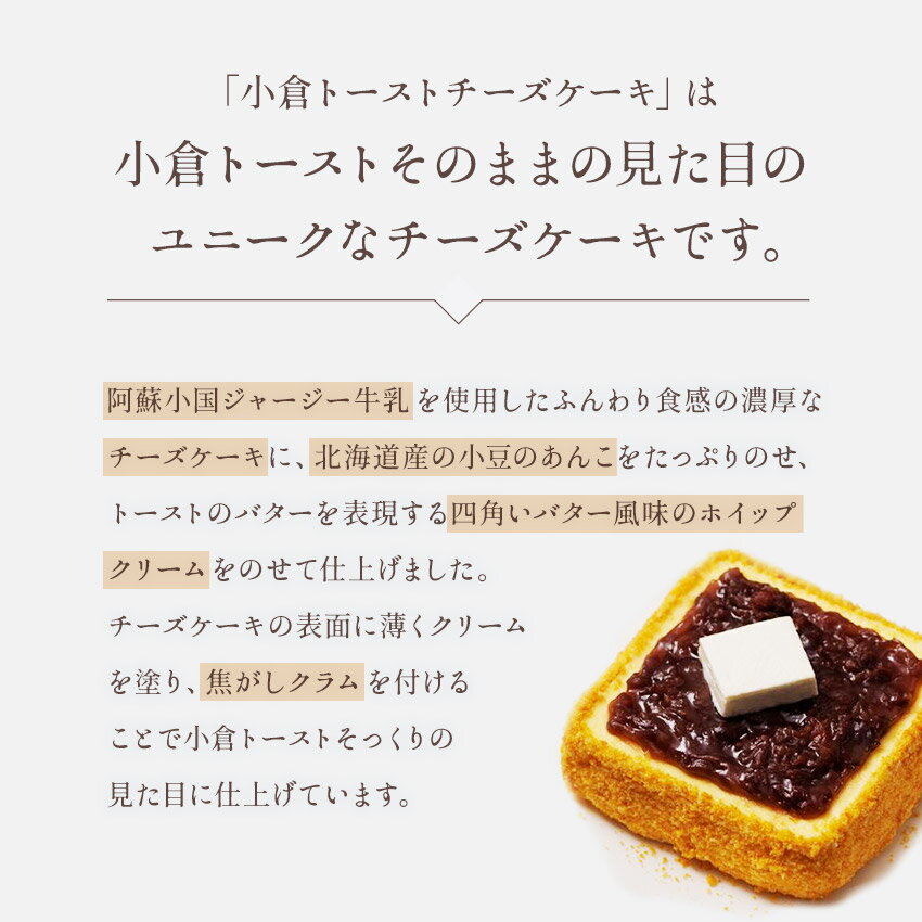 阿蘇小国ジャージー牛乳を使用したふんわり食感の濃厚なチーズケーキに、北海道産の小豆のあんこをたっぷりのせ、トーストのバターを表現する四角いバター風味のホイップクリームをのせて仕上げました。